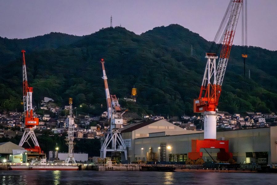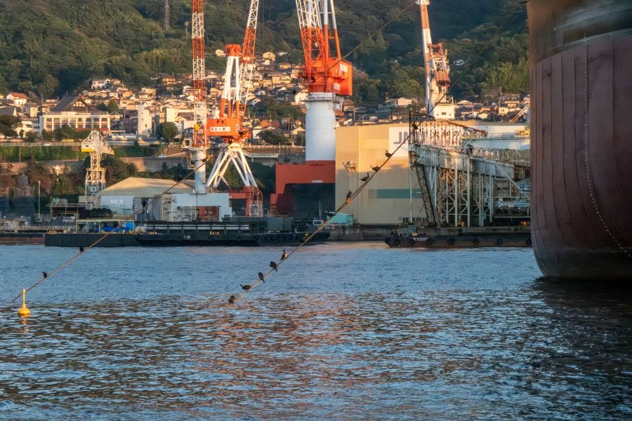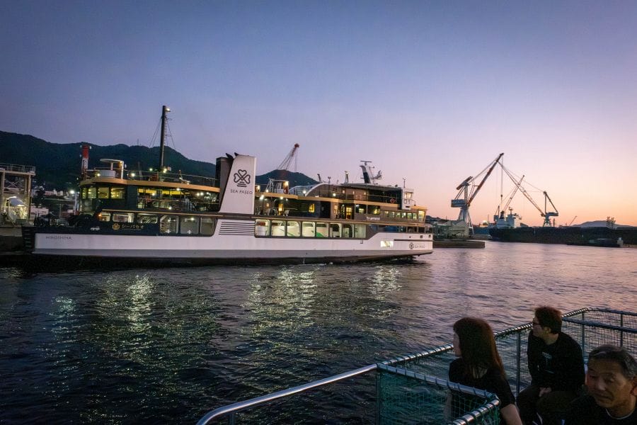 From the boat, you can see some of the other sights of Kure too. A huge banner on an even bigger shed announces it to be The Birthplace of the Battleship Yamato. High on the distant mountainside you can see the pagoda of Mangan-ji Temple, reminiscent of the pagoda masts of WWII-era Japanese battleships. On the twilight cruise, you can see Mangan-ji pagoda lit up.