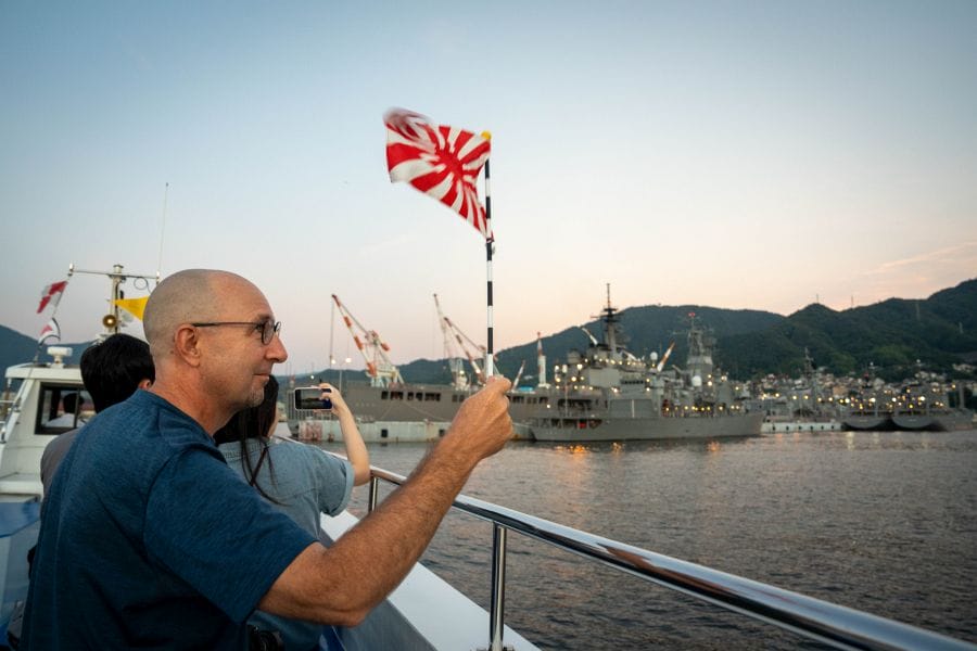 The guide provides a fascinating commentary on each of the vessels currently in dock, including its role, history, armament, and general scuttlebutt. You’ll see helicopter carriers, stealth destroyers, intelligence ships, cable laying ships, and sleek black submarines. Seamen aboard the vessels are likely to give the cruise boat a friendly wave, and Rising Sun flags are available for encouraging the swabbos. You can get a close look at the day-to-day activities of the ships, including lowering the ensign at dusk, accompanied by a comically bad bugle fanfare.