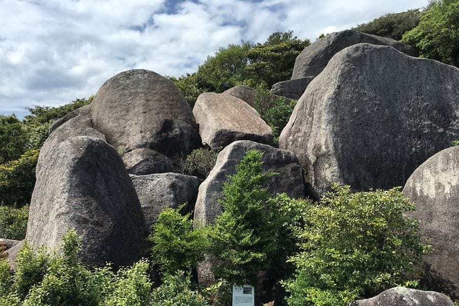 Tōjindaba is a prehistoric megalithic site located on a hill above Cape Ashizuri. This mysterious and impressive group of massive stones dates from the Jōmon period, from about 12,000 BC to about 300 BC, when the Japanese were hunter-gatherers with a relativity complex culture. The site comprises a flat henge area that was unfortunately bulldozed flat before any excavation could be performed. From here you can see clumps of huge stones on a hillside. The henge area has a few boulders remaining. From here it’s a short walk up the hill to megaliths. The magnetic orientation of these vast stones indicate that they were moved at some stage, but whether this occurred through glaciation or by human effort isn’t known. The rocks, which have interesting natural veins, also show signs of having been shaped by humans. Some of them seem to be arranged in circles, hence the site is also called a ‘stone circle’. Whatever the history of the stones, it’s very exciting to clamber over and among such enormous boulders, located as they are with a stunning view over the coast and ocean, under an expansive sky.