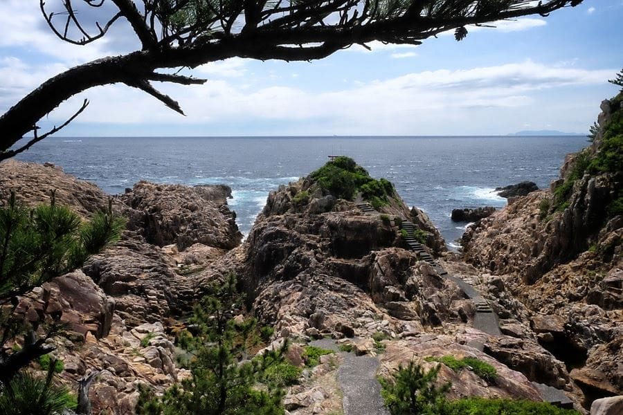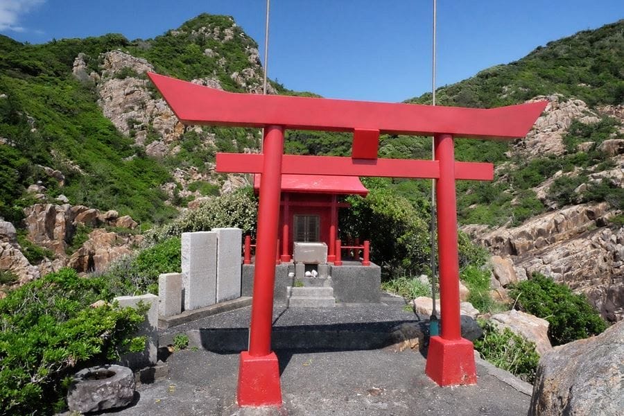 Not far away is Usubae Cove, a place of great scenic and human interest where the mystical power can be felt again. This dramatically picturesque cove is accessed through a forest of coastal trees that have been swept into flattened, tortured shapes by the incessant wind. When you emerge from the tunnel formed by the trees, you find yourself in a natural amphitheatre of rocks, whose layers have been thrown on their sides by crustal action, then eroded by the sea. In the centre of the scene is an outcrop higher than the rest, topped with a red shrine and torii gate.