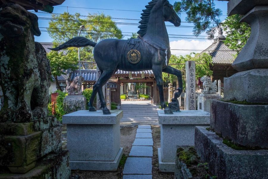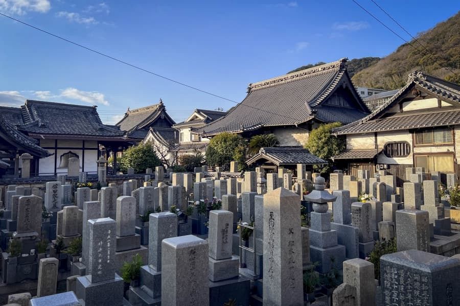 Temples typically have a large wooden gate and a main hall (hondō) with a high tiled roof. They usually have a belfry and a cemetery. Larger temples may have a pagoda.