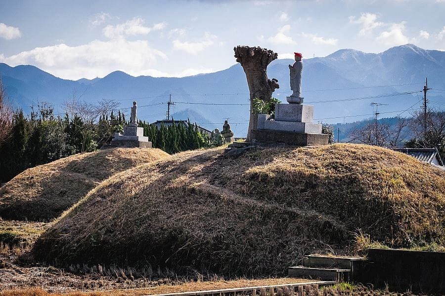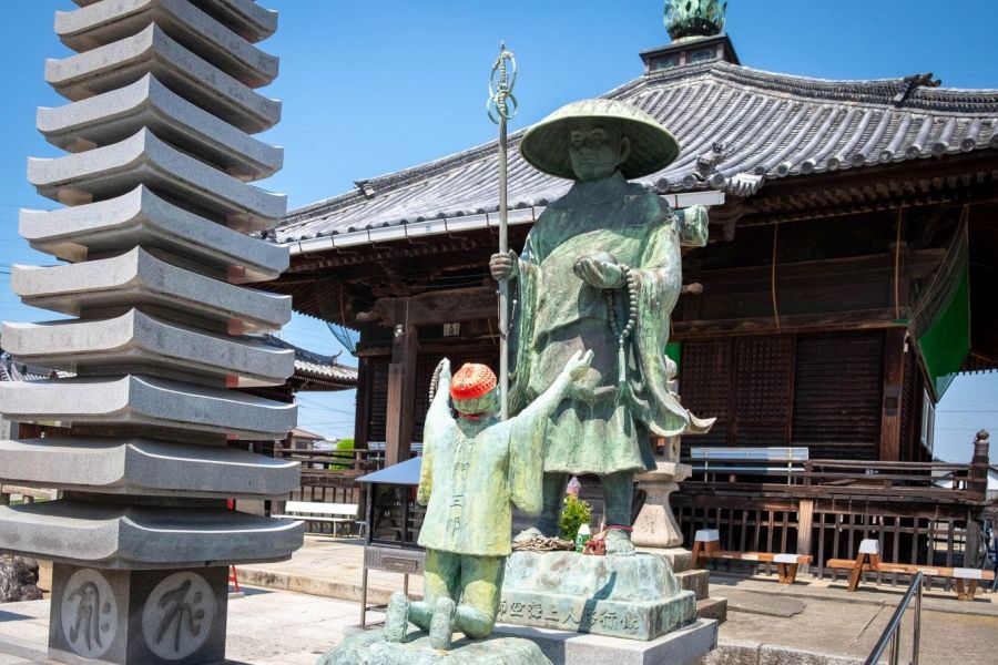Kūkai, whose posthumous name is Kōbō Daishi, was a real person. He was born at Zentsū-ji in Shikoku, and his remains are preserved at Mt. Kōya in Wakayama. He certainly visited many of the temples on Shikoku, undertook ascetic practices, and carried out numerous public engineering works. Kōno Yasukata was also a real person. But there’s no record of anybody called Emon Saburō. However, there are some suggestive indications that such a person may have existed. Temple 46 outside Matsuyama is called Yasaka-ji (likely etymology: yatsu zuka = eight tombs). Nearby are eight ancient burial mounds, which are said to date from the time of Emon Saburō and to hold his eight sons.
