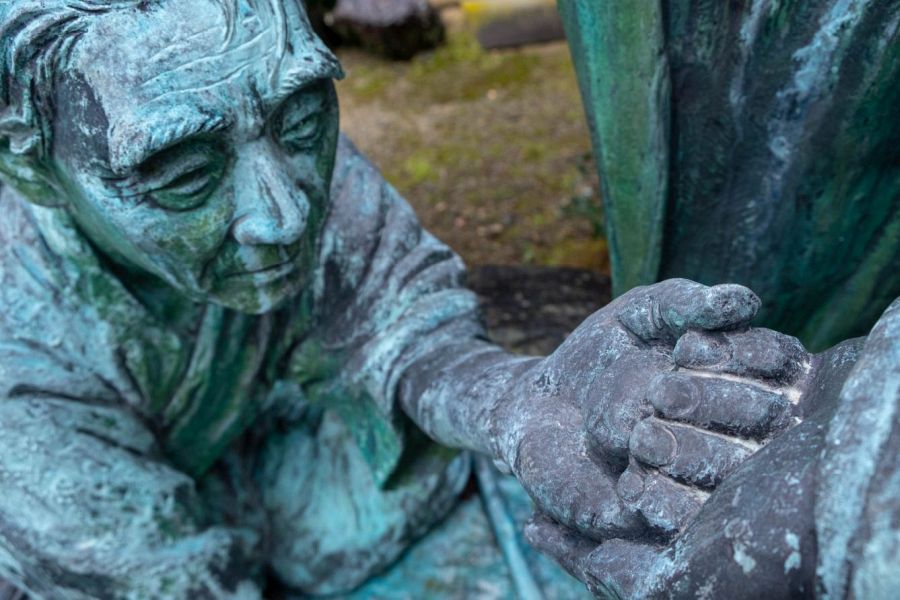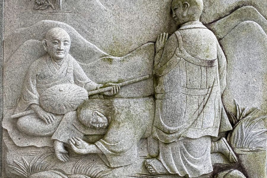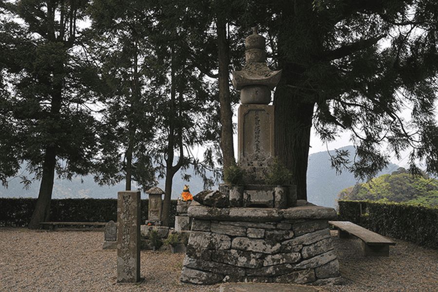 Thereafter Saburō’s eight children fell ill and died, one after the other. Recognizing at last his own wickedness, Saburō went to the mendicant’s hut to ask forgiveness, but the mendicant had moved on. Saburō left his home and followed the priest, eventually making twenty circuits of Shikoku clockwise, a task of at least four years. But in vain. Finally, he tried the route in reverse. Exhausted, he collapsed on the road, and as he lay dying, the mendicant appeared. The priest was Kūkai. Saburō begged forgiveness and received absolution. Kūkai asked him if he had a final request. Saburō asked to be reborn into a wealthy family in Matsuyama so that he might restore a neglected temple. Kūkai picked up a stone, wrote something on it and gave it Saburō who then expired, holding the stone. Kūkai buried Saburō, and marked the place with the staff that had supported Saburō on his long journey.