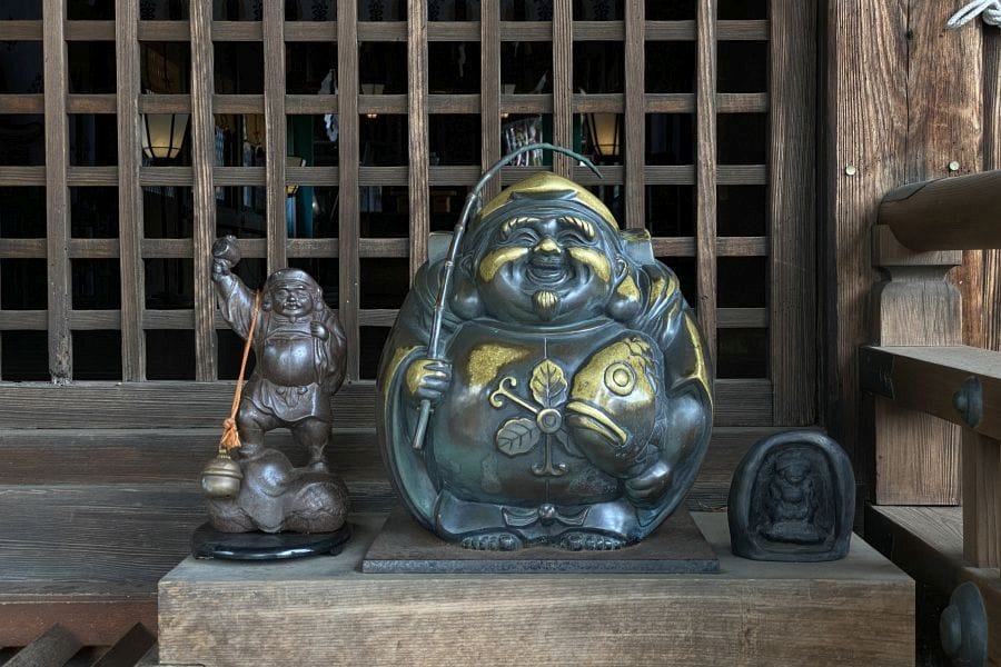 Ebisu is the only one considered native to Japan. He’s patron of fishermen and merchants, usually shown holding a fishing rod and a large red sea bream, a fish associated with celebration. In many fishing communities he’s still quietly venerated for safety and a good catch. Major shrines such as Nishinomiya Shrine in Hyōgo are dedicated to him, and the January Tōka Ebisu festival draws huge crowds of business owners buying lucky bamboo branches for prosperity. Unlike the others, Ebisu has a slightly rustic character — a working god for working people. He’s perhaps best known spelled as Yebisu, representative of a brand of Sapporo Beer.