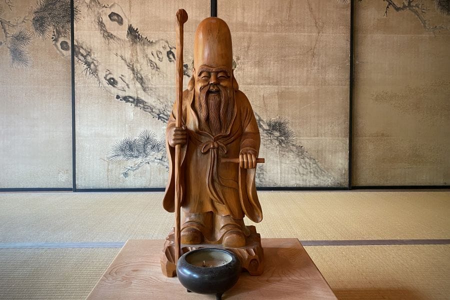 Jurōjin is another longevity deity of Taoist origin and is sometimes confused with Fukurokuju. He’s depicted as an elderly scholar with a white beard, carrying a staff from which hangs a scroll said to record the lifespan of every living being. A deer often appears at his side. In some traditions the two are considered manifestations of the same star deity.