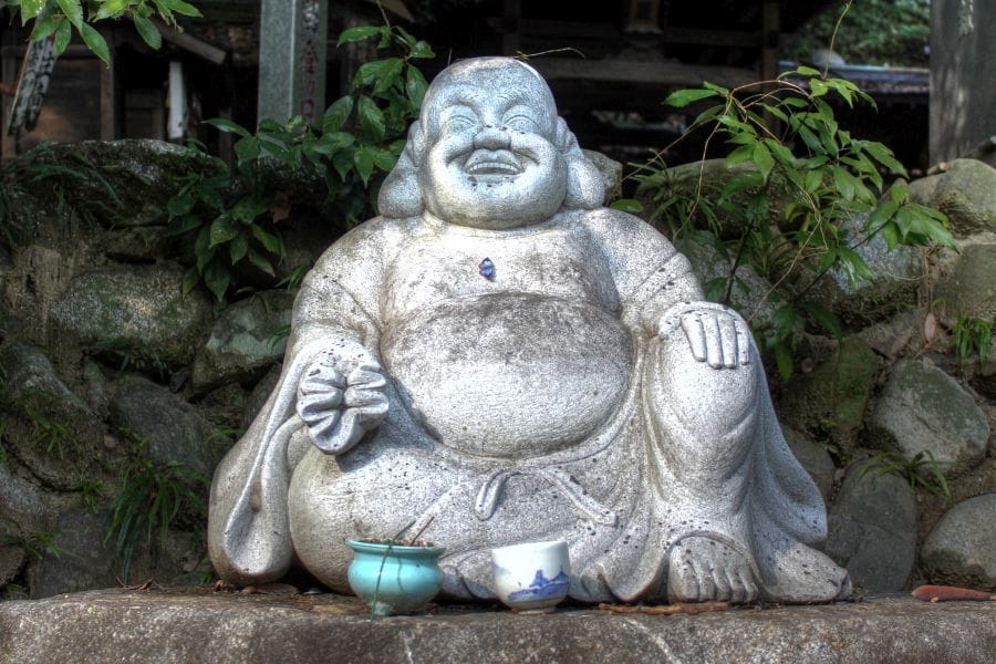Hotei is based on a semi-legendary Chinese monk known for wandering with a cloth sack, giving sweets to children. In Japan he became a symbol of contentment and generosity. His large, exposed belly and broad grin make him one of the most recognisable figures in temple precincts. He represents abundance of spirit rather than wealth in coin. He’s sometimes referred to mistakenly as a ‘happy Buddha’.