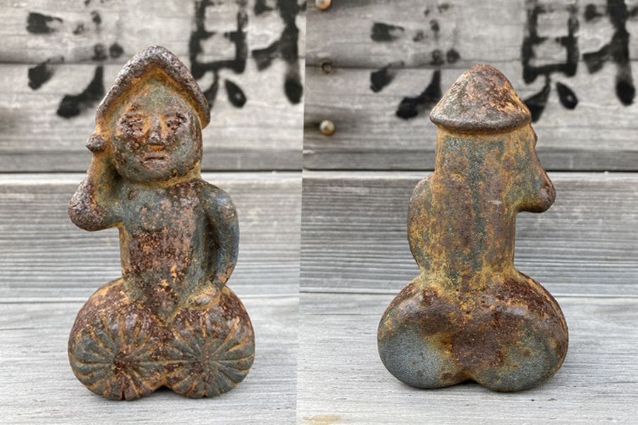 Daikokuten stands on rice bales, carrying a sack of treasure and a wooden mallet that grants wishes when shaken. His origins lie in the Hindu Mahākāla, transmitted through esoteric Buddhism, but in Japan he became associated with food, kitchens and household wealth. In some homes he was once enshrined near the pantry. He’s often paired with Ebisu in shops and shrines, forming a complementary duo of commerce and abundance. His shape lends itself to covert phallic symbolism.