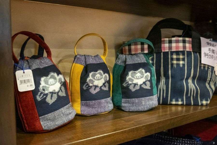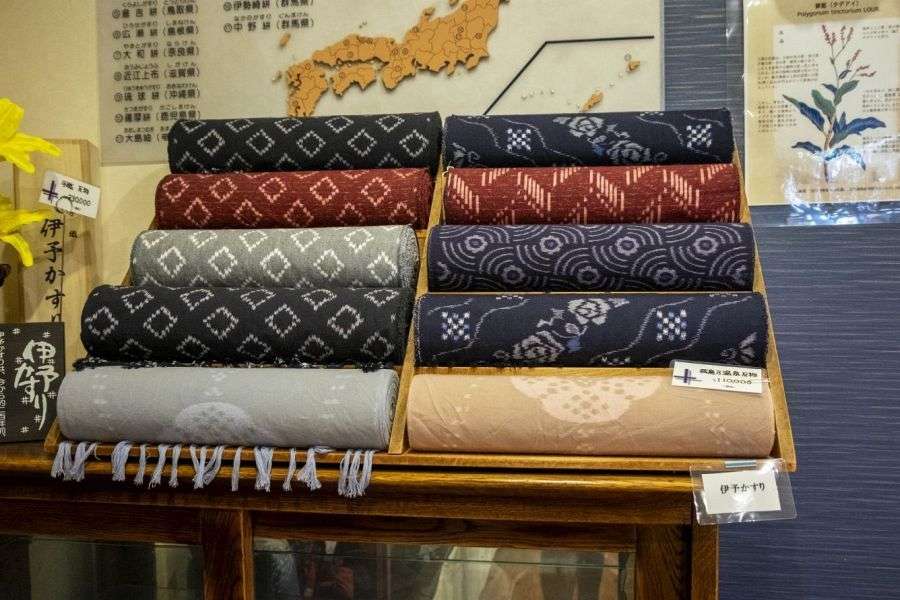 Art Labo Kasuri is a shop selling products made of Matsuyama’s traditional textile, Iyo Kasuri, a kind of ikat. Production of Iyo Kasuri began about 200 years ago, when a local woman, Kagitani Kana, devised a method of reproducing a simple woven pattern. This became a hit nationwide so that Iyo kasuri accounted for 26% of all ikat produced in 1904. It was widely used for kimono and other garments.
