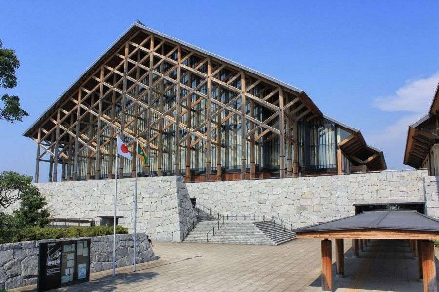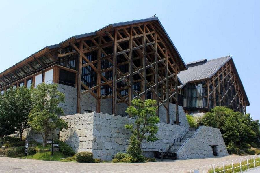 The base of the building looks like castle walls with huge, rough-hewn granite stones, and a superstructure reminiscent of a temple or meeting house. It boasts the largest gable roof in Japan, covered with 320,000 tiles from nearby Kikuma, the center of Ehime’s tile industry. The design called for the use of vast quantities of wood to demonstrate the feasibility of building large structures with renewable materials and to stimulate local forestry. Indeed, supplying materials for the building resulted in a considerable boost to the local economy. Five months after completion of the facility, the number of visitors increased nearly six fold. Twenty major events have been held here, including one international athletic competition and a visit from the Dalai Lama.