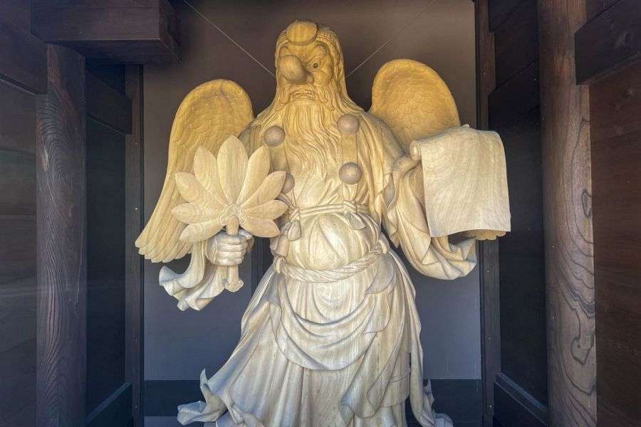At the bottom, you pass through two torii gates, one painted red, the other of stone. There’s a car park on the left, and if you want to enjoy the shrine in its entirety, this is the place to park. Next to the car park is a new gate house in traditional style, with magnificent shishi lion guardians, and in the gate itself, wooden tengu, the long-nosed, winged beings who are said to inhabit Japan’s mountains. Beautiful pink cherry blossoms flower in April.