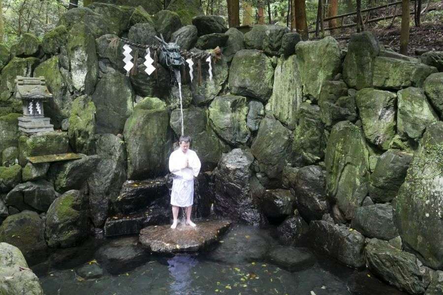 Beyond the gate is a path through a forest of bamboo and trees, including a big cypress bedecked with a Shintō straw rope and tassels. Insects buzz and birds sing. The atmosphere here is of an isolated, hallowed mountain. At the top of a flights of stone steps is a compound of concrete buildings. The next section is wonderful, with mossy trees, a beautiful pond with carp, eccentric stone lions, and a dramatic dragon fountain spewing water straight from the mountain. The final stretch calls to mind the route to the peak of Ishizuchi itself, which passes up steep rock faces hung with chains. Here, sweeping staircases with chains for handrails pass up through precipitous stone walls.
