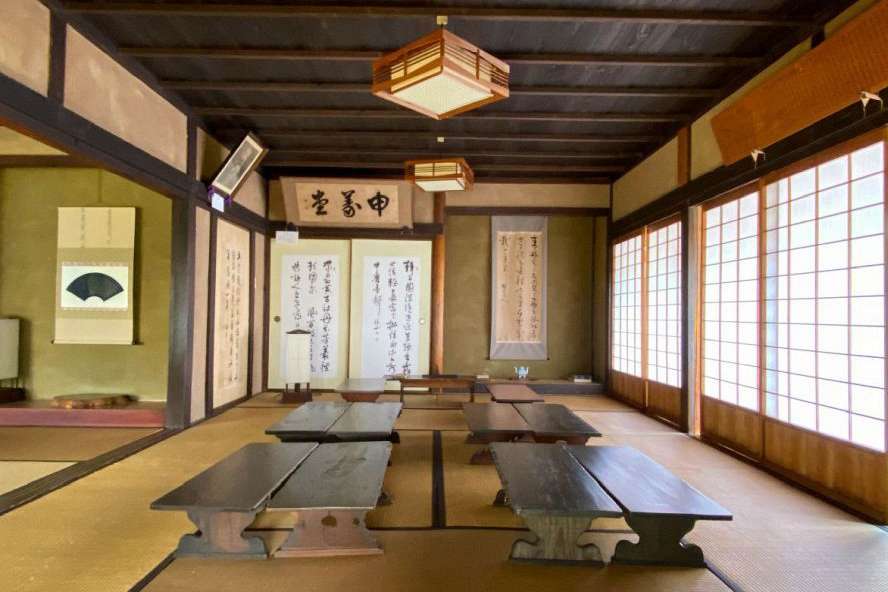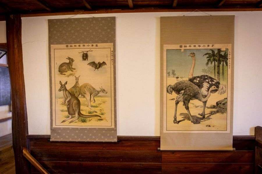 The building to the right of the entrance is the Shingi-do, a private school and the forerunner to the Kaimei School. Built later, the main, two-story school building is now a museum with displays of textbooks, photos of pupils, school uniforms and educational materials from the Meiji, Taishō, and Shōwa periods. One room of the school is given over to a simulation of how a classroom looked, complete with hard benches, educational posters and a dummy student with a metal pail and cloth for scrubbing the bare wooden floors. The interior with its wooden pillars and creaky floorboards is very atmospheric.