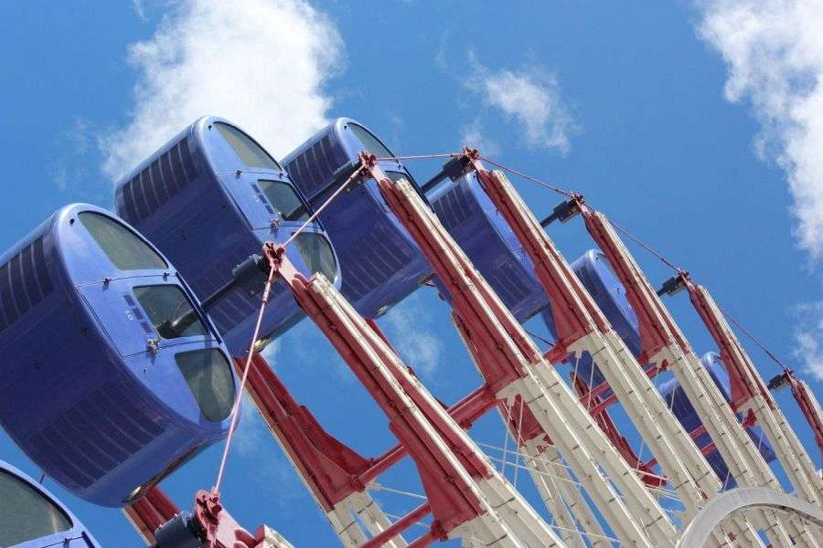 At the very top, the wheel seems to stop, suspended in space above the city with the sea and the mountains in the distance. But the wheel goes on round, and soon you’re back at the bottom. One rotation takes 15 minutes. Daytime is great, but dusk is also an interesting time, when the sun is fading, and lights are coming on below you.