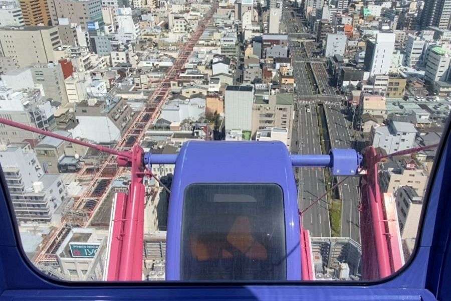 The sounds of the city enter the gondola with remarkable clarity—the train whistle of the Botchan Train and the screech of the trams on their rails.