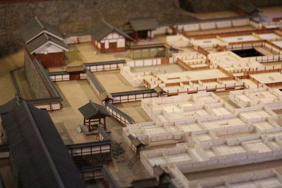 The garden is the site of the accommodation of the lord of Matsuyama Castle and his family. Although these accommodations no longer exist, the foundations are marked by low walls filled with water, which now form part of the garden. There’s also a huge stone-lined well, eighteen meters by thirteen across and nine meters deep, with steps descending to the bottom. The building over the gateway has a number of interesting dioramas and other exhibits.