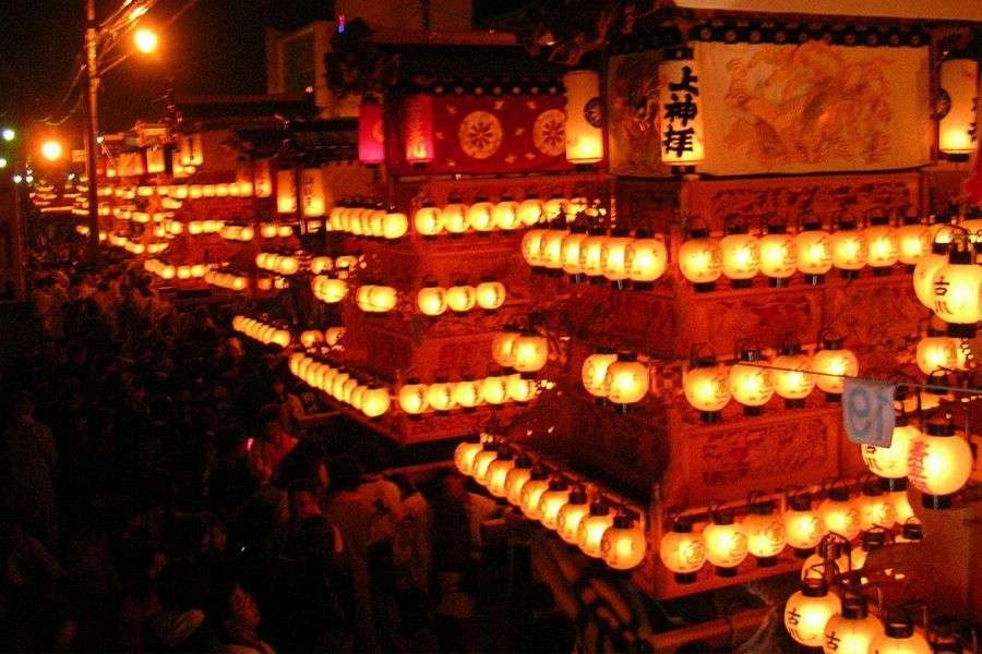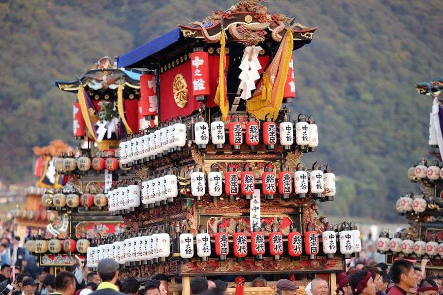 In the middle of October, one of the liveliest festivals in Shikoku is held in Saijō. Over 80 _danjiri_, a kind of festival juggernaut, are paraded through the city, gathering on the banks of, and in, the Kamo River. At dusk, with their myriad lanterns, the danjiri present a fantastic spectacle in the river.