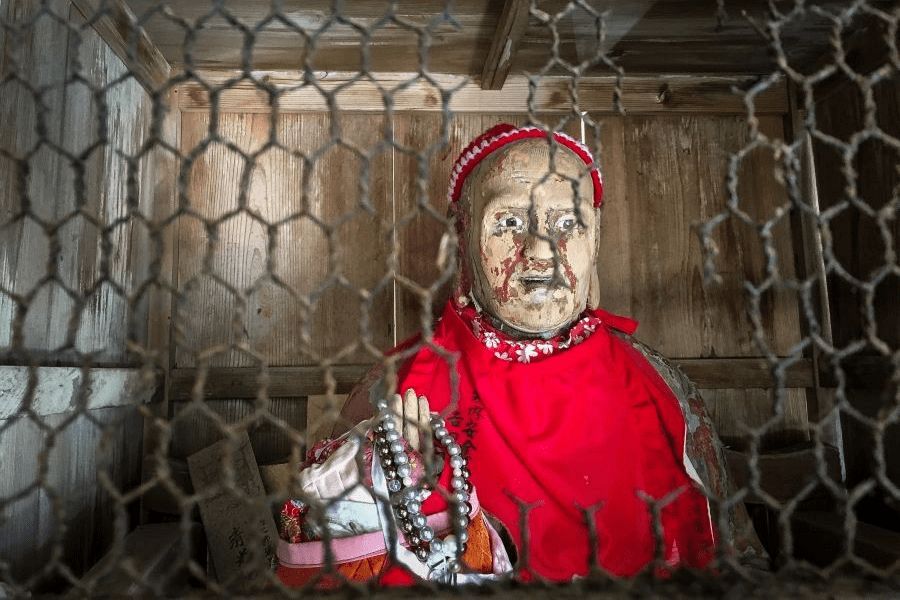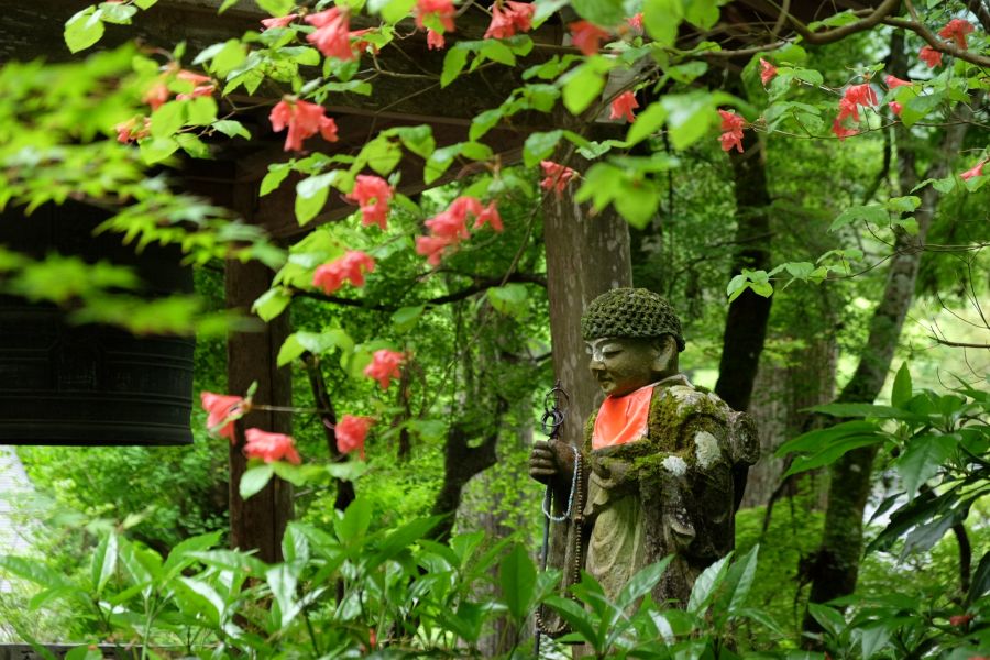 Up more steps are two belfries. The one on the left is the older one, and the one on the right is a bell of peace that memorializes local people who died in the Pacific War. The main hall is at the top of the steps with a bronze eleven-faced Kannon statue standing between the main hall and Daishi Hall. The Daishi Hall is made of Japanese cypress and was rebuilt in 1984. A Kōgyō Daishi Hall enshrining the monk Kakuban is tucked away behind the Daishi Hall. At the far left of the main hall is the Kannon Hall where the Kannon statue that was found here is enshrined.