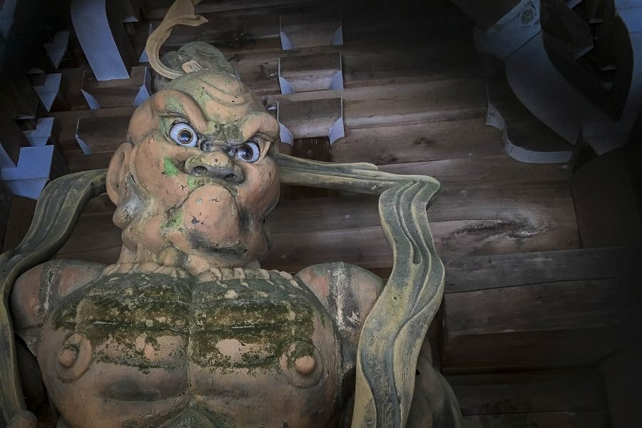 Crossing a bridge with a red balustrade, you enter a forest of enormous cypress trees. A footpath leads up to the Niō Gate with two storeys and a gabled, hipped roof. On the right foundation of the Niō Gate, a three-way standoff between a snake, frog, and slug is depicted. The gate is adorned with a massive pair of pilgrim’s straw sandals.