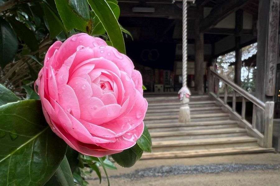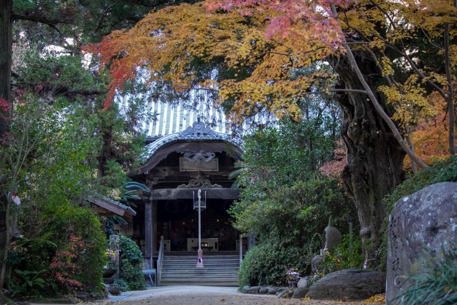 The road in front of the temple is the old Tosa Kaidō, once the main road to Kōchi. A large stone carved with the name of the temple flanks some steep stone steps up to the precincts. Legend has it that Emon Saburō came from this area, and a stone monument at the bottom of the steps is engraved with a haiku written by Masaoka Shiki.