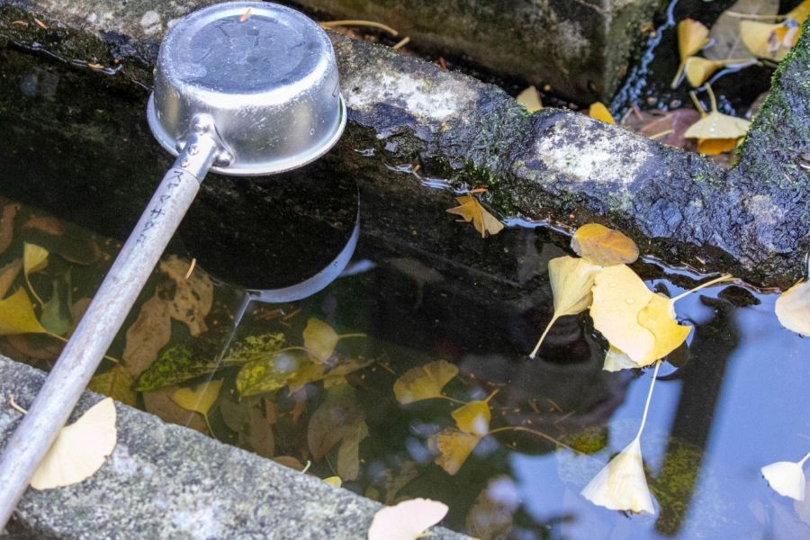 The belfry is on the right and the temple office on the left with a Buddha’s hand stone. Further ahead, on the left are a washbasin and a Buddha’s foot stone on the left. The huge tree to the right is a one thousand-year-old Ibuki tree, said to have been blessed by Kūkai. At the foot of the tree is a carving of Kūkai seated in a rice husk which is said to confer bountiful harvests.