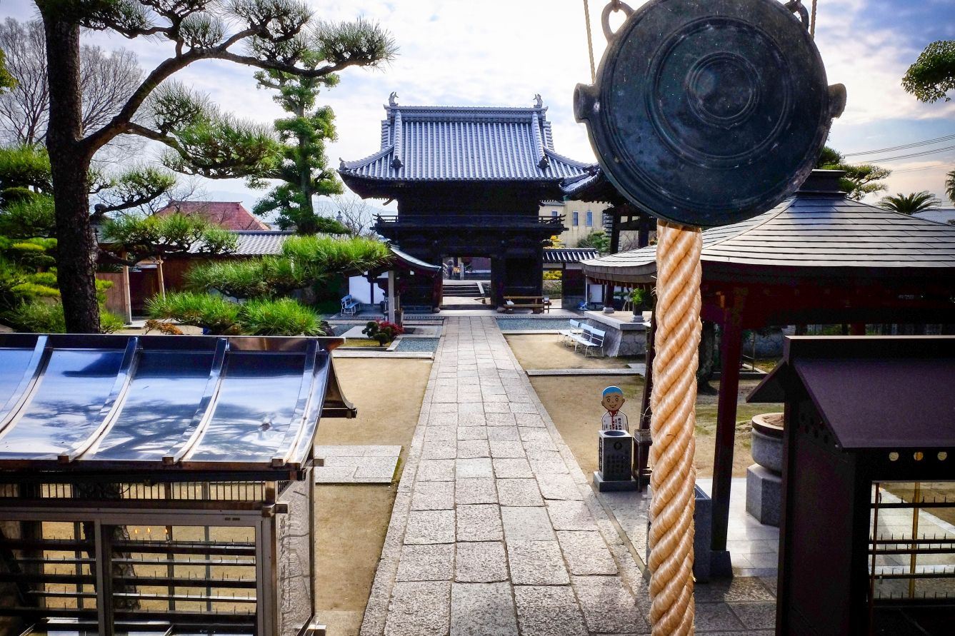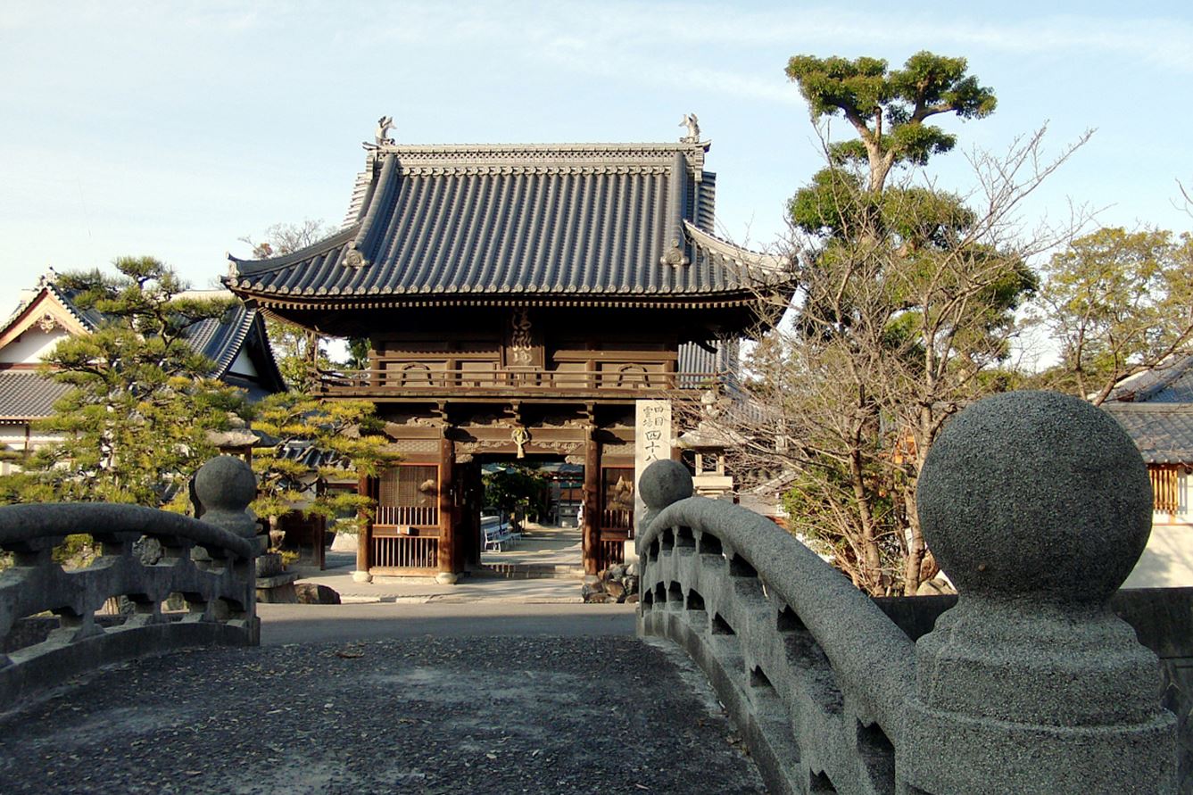 Sairin-ji, The Temple of the Western Forest, is temple No. 48 on the Shikoku pilgrimage, or Henro. It sits on a low-lying plain next to a little river. From the temple, you can see Mt. Ishizuchi, the highest mountain in western Japan. In winter, its snowy peaks present a fine sight.