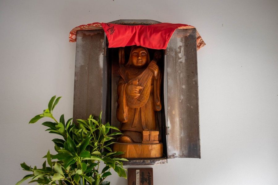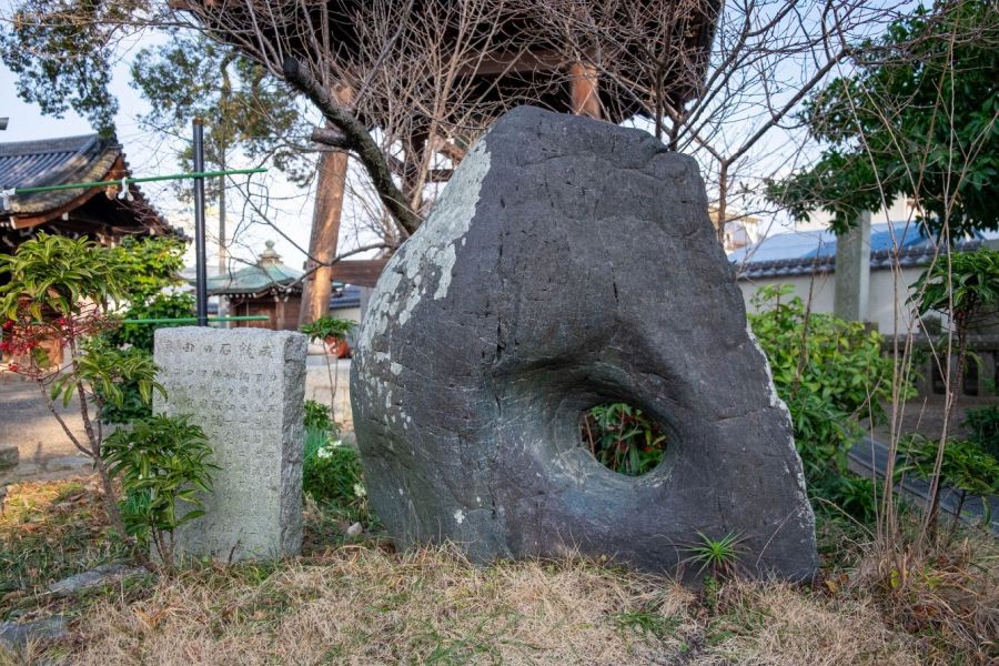 In the grounds of the temple, you’ll see a stone with a hole in it. It’s said that if you put your kongozue or pilgrim’s staff into it, your prayers will be granted. Next to this stone is an elegant statue of Kichijōten standing on a stone plinth that you can pass through. Going through it relieves you of poverty, so by all means, pass under Kichijōten.