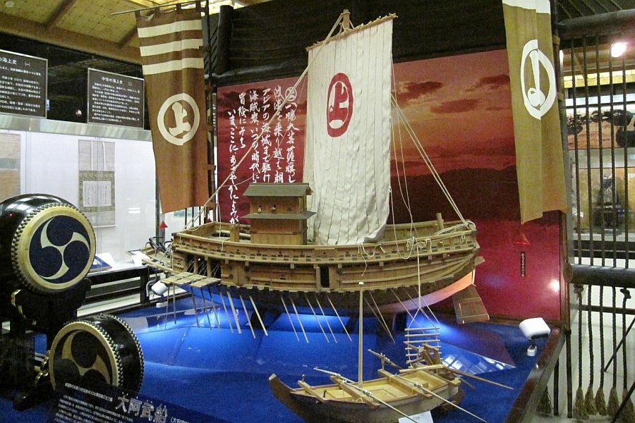 During the Warring States period in the Middle Ages, the Murakami Suigun was one of the maritime clans that dominated the Inland Sea. These clans were regarded as pirates by land-based clans. One branch of the Murakami was based on Innoshima, where they had a rudimentary wooden fortress. In 1983, a today’s concrete castle was built as a museum to house historic artefacts. It isn’t an authentic recreation.