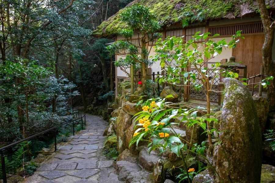 A path leads up from the entrance to the main hall, passing various beautiful buildings – a red, two-storey pagoda, rustic teahouses, one which serves traditional Japanese food, a Shintō shrine, the priest’s home, and a little pavilion. The grounds are dotted with statues of Buddhist deities and illustrious priests in varied styles. It takes quite a while to make your way up to the main hall perched on stilts between large rocks. There are more impressive statues in and around the main hall. The temple is lovely in all seasons, but the autumn colours are particularly spectacular.
