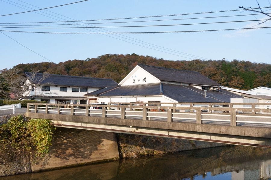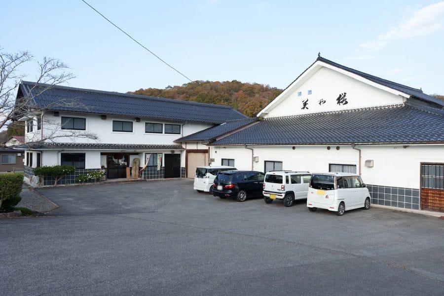 Miwasakura Brewery is located in the countryside just south of the urban centre of Miyoshi, in a basin of rice fields. The large white brewery buildings rise above the smaller houses around.