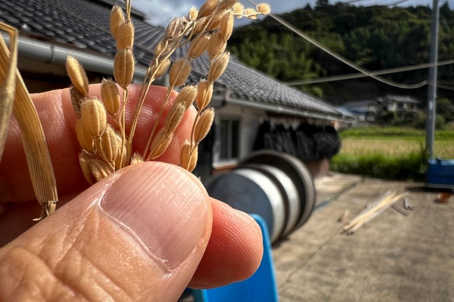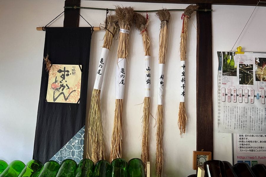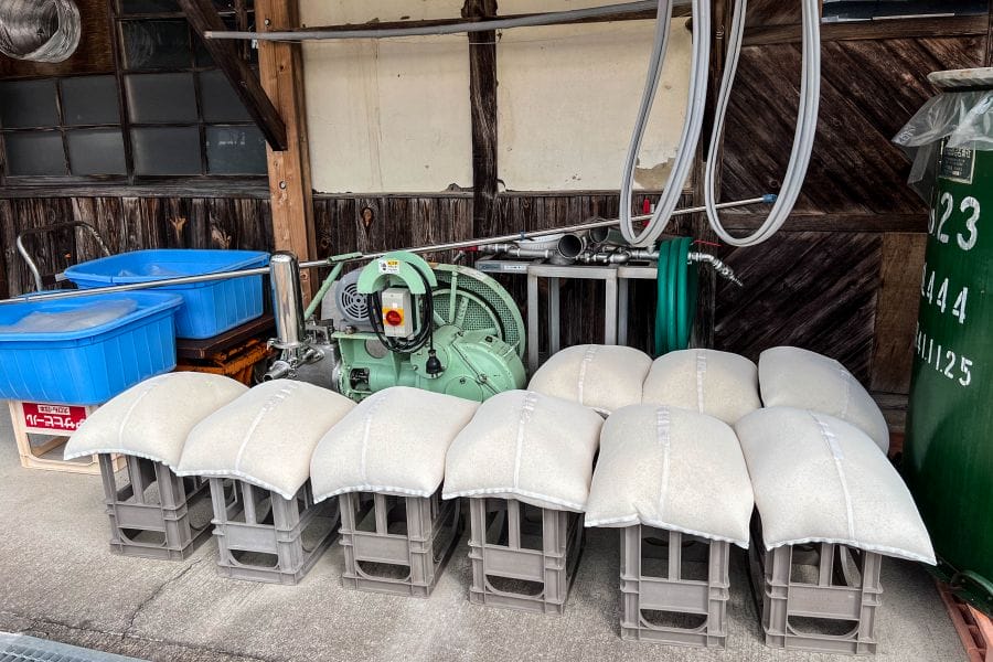The brewery uses rice grown locally by contracting farmers, who use sustainable practices such as using ducks to weed the paddies and keep down pests instead of using herbicide and pesticides. The brewery favours the Kame-no-o, Yamadanishiki, Omachi, and Shinsenbon varieties. Located 350 m above sea level, Miyoshi has a big difference between day and nighttime temperature, which results in robust rice with a lot of starch, ideal for brewing.