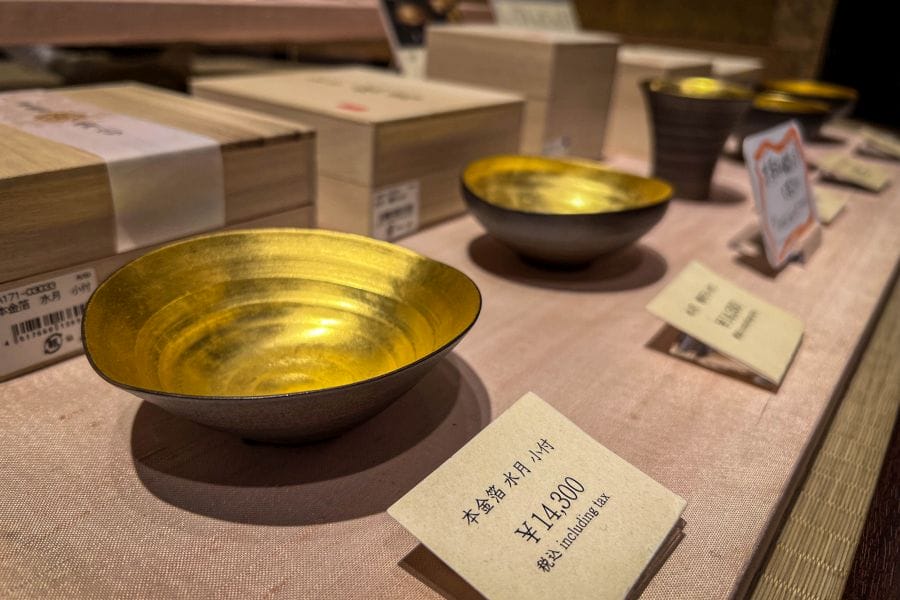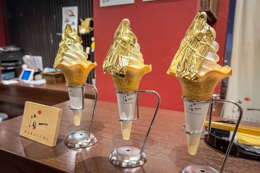 In the present day the core of Higashi Chaya District has a mixture of uses that reflect both preservation and adaptation. Several old teahouse buildings have been repurposed as cafés, craft shops, confectionery boutiques and restaurants, many specialising in local goods such as wagashi (traditional sweets), gold-leaf merchandise and matcha tea. Gold leaf is a signature craft of Kanazawa, and shops in the district, including outlets of the well-known Hakuichi brand, sell gold-leaf cosmetics, edible gold leaf, and related souvenirs. The Hakuichi Higashiyama Store occupies a building whose décor evokes traditional Higashi Chaya ambience, combining lattice design with a multi-storey interior. It’s notable as the birthplace of the gold-leaf soft ice cream that has become a must-eat local treat. It should be noted that gold doesn’t taste of anything, but the rich milky soft-serve is delicious, and gold leaf on your lips makes an Instagrammable moment. Hakuichi offers a range of craft and skincare products alongside sweets. In an annex building, you can try your hand at adding gold leaf to one of several items of practical use, which make attractive souvenirs.