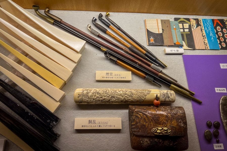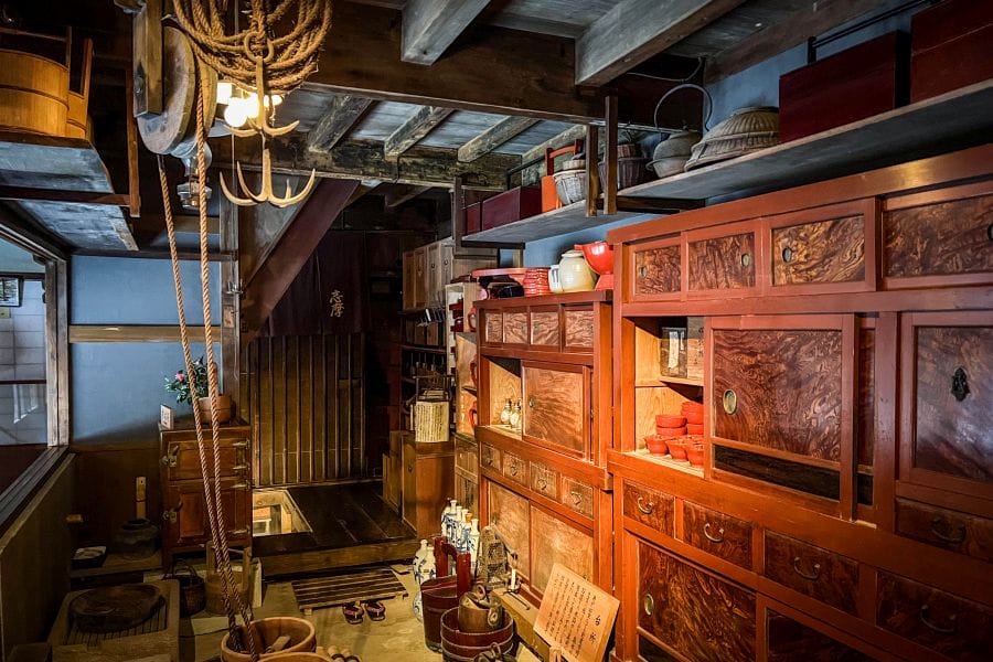 Among the historic teahouses in the district, Ochaya Shima (Shima Geisha House) is one of the most important. Built in 1820 and designated an Important Cultural Property, it functioned in its time as a working teahouse where geiko entertained guests. Today it’s a museum that preserves the original interior layout and features, including the upstairs guest rooms, a geisha dressing area, a small internal garden, and a large kitchen. There are displays of traditional tools of the trade such as shamisen and biwa instruments. The interiors, with lacquered wood and elegant furnishings, remain much as they were in the Edo period. There’s the option to enjoy a cup of matcha green tea with a sweet in an authentic setting.