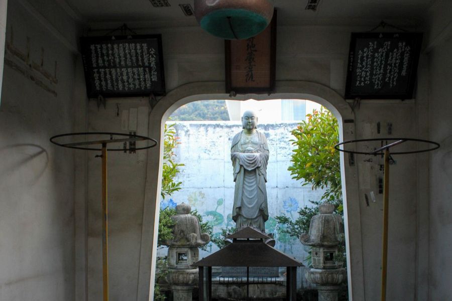 Tennō-ji is temple No. 79 on the Shikoku pilgrimage, or Henro. Its name derives from the fact that Sutoku Tennō (Emperor Sutoku) lay in state here after his death in 1156, following banishment from Kyōto after his attempted coup against his brother. The temple is nestled in a valley near the Inland Sea in Sakaide. It stands at the foot of Mt. Kanayama, a mountain known as a source of metal ore for centuries.