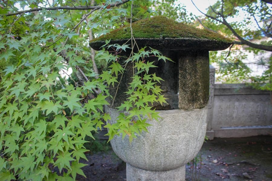 Unusually for a temple, the main gate is a red Miwa torii gate, itself of an unusual four-legged kind, reflecting the temple’s origin as a Shintō shrine. The plaque bears the inscription ‘Emperor Sutoku’, while the pillars are inscribed with ‘1734, Joint Effort of Parishioners, Current Head Priest: Hōgen-dai’.