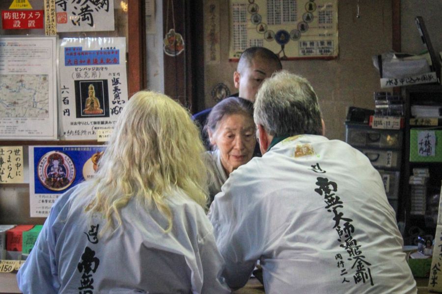 With the main hall on your left, there’s a white pagoda, which is the Daishi Hall and also the temple office. It’s accessed through the gate on the right into a shop selling pilgrim’s goods. In front of the Daishi Hall is a statue of Kūkai covered in gold leaf, and a painted stone statue of Fudō Myōō.