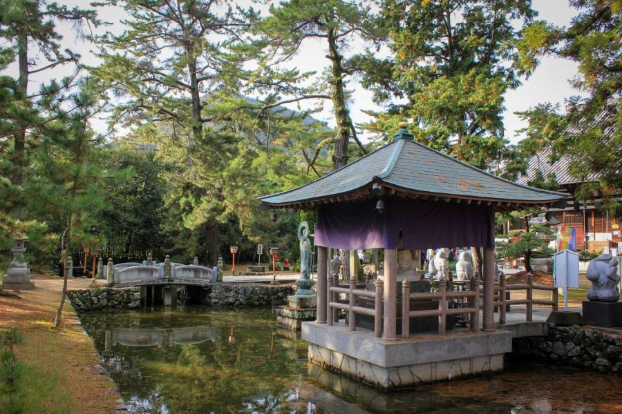 After passing through the temple gate, the path is flanked on both sides by a mini Shikoku pilgrimage represented by stone Buddha statues. These were originally found in a nearby village and were moved to the precincts in the 1920s. On the left is the Enma Hall and, on the right, the oldest temple bell in Shikoku dating from the Heian period. Ponds grace the central part of the approach.