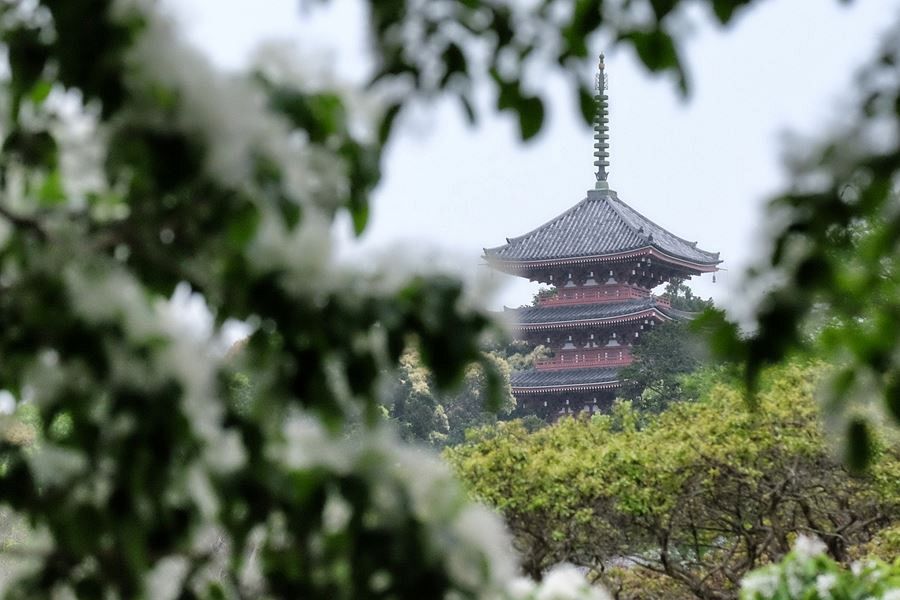 Part of the garden once belonged to the grounds of Chikurin-ji Temple, whose red pagoda can be glimpsed through the greenery of the park.