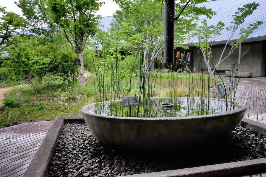 You enter the gardens through a passageway of intense greenery, arriving in an open structure covered with an acutely-angled, sweeping circular roof. In the middle of this area is a stand of delicate bamboo. The buildings were designed by architect Naitō Hiroshi using locally produced wood. A glasshouse near the entrance is filled with an extraordinary variety of exotic plants, including many of the orchids which particularly fascinated the botanist.