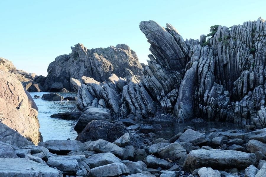 Muroto’s dramatic coastline was formed through an ongoing process where the layers of ossified sediment on the seafloor are thrust up and exposed by the forces of continental drift. The rocky beaches of the seashore constantly change shape with the action of the weather and tides. Some of the geological features have been attributed to the mendicant priest Kukai, founder of the Shikoku Pilgrimage, fifteen centuries ago. Pits in the rock are said to be where his staff struck, and wave marks above a rock pool are where he rubbed his back when he bathed there.