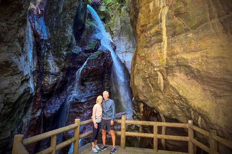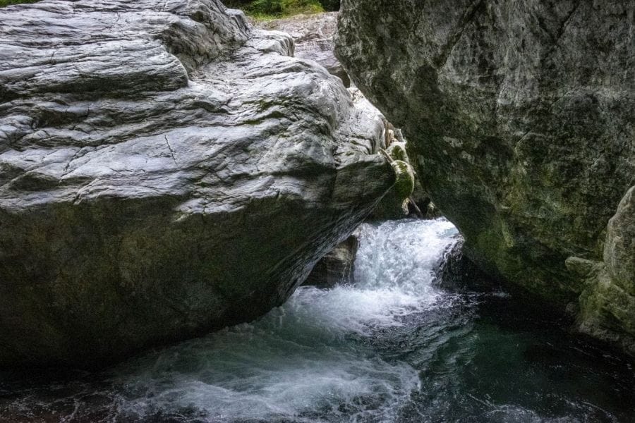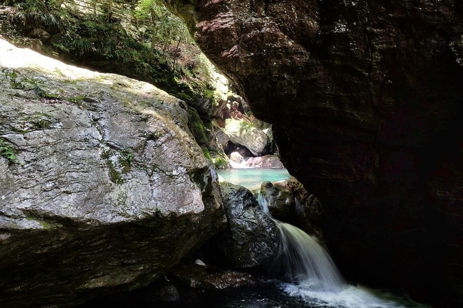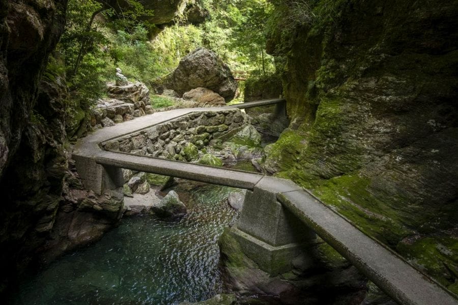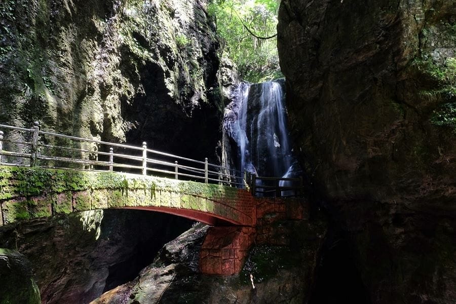 Towards the top of the gorge, the path is steeper and the sound of falling water becomes more intense. Several bridges lead into a couloir with a spectacular waterfall that pours in numerous streams into pools at different levels. The spray thrown up creates rainbows in the sunbeams that penetrate into the cavernous space. Leaves drifting down from above complete a magical scene.