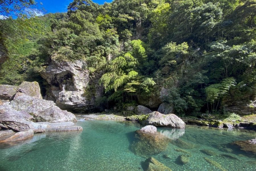 A short way up the tributary of the Niyodo River is the Nakatsu Gorge, a natural paradise of boulders and dramatic waterfalls, linked with an easily-walked path and bridges. Interesting birds dive for fish in the translucent pools between the cascades. The clear, blue water churns between the huge boulders that fill the bottom of the gorge. As the path climbs gently upwards, you pass through narrow passages and tunnels between the rocks. Everything sheltered is coated in ancient moss. Here you can experience the turquoise water known as ‘Niyodo blue’.