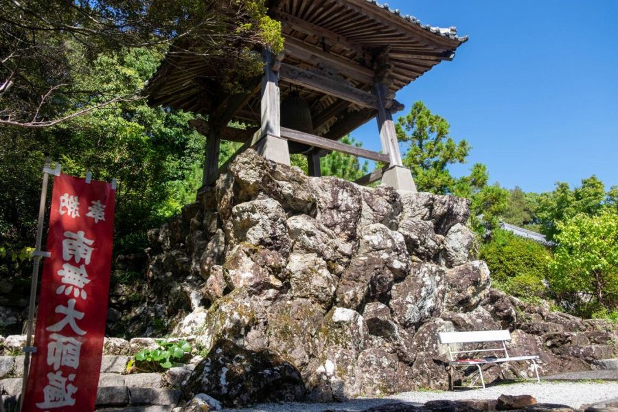 The temple is accessed by a flight of stone steps topped by a gate. On the left is a belfry on a stone platform. The stones used around the temple are of a rough laval rock similar to those used at Kōchi Castle.