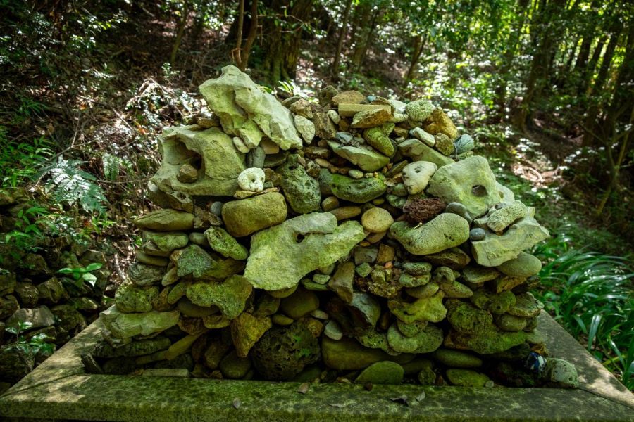 A path leads eastwards through the forest to the inner sanctuary. There’s a cairn of stones that have been selected for having one or more holes, including some rather fine corals. These were offered by people who experienced miraculous cures for head ailments.
