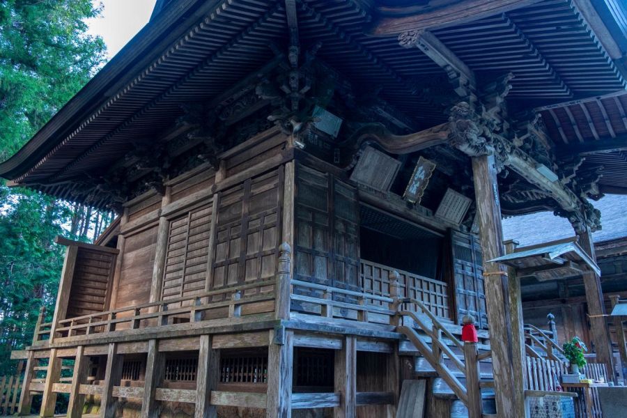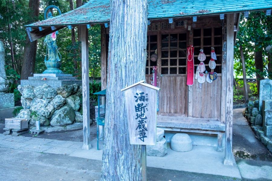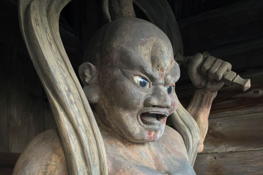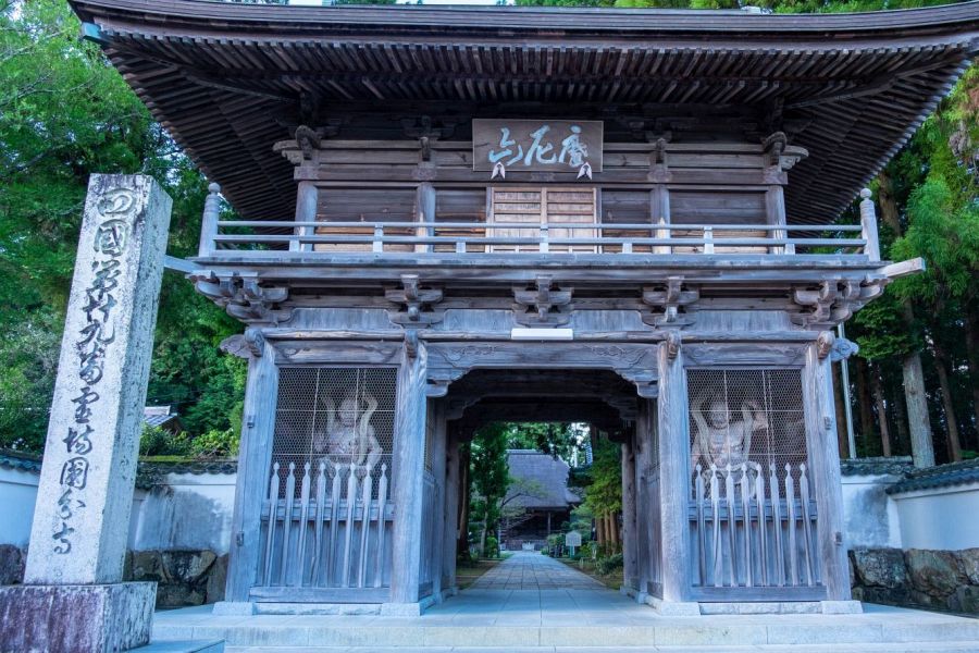 The temple is surrounded by white plaster walls. The imposing main gate built in 1655 houses remarkably smooth Niō guardians with glass eyes, which gives them the appearance of the aliens known as ‘greys’. The plaster walls lead up a passage lined with cedar trees. On the right is wash basin and belfry, and on the left is a building commemorating the foundation of the temple rebuilt in 1849, it enshrines Gyōki. In line with the main gate is the main hall with its massive, elegant cedar roof. The main hall dates from 1558. Next to it is the copper-roofed Daishi Hall built in 1634. In front of the Daishi Hall is statue of Jizō dedicated to the renunciation of intoxicating drink. In front of the main hall and Daishi hall is a garden with cherry trees.