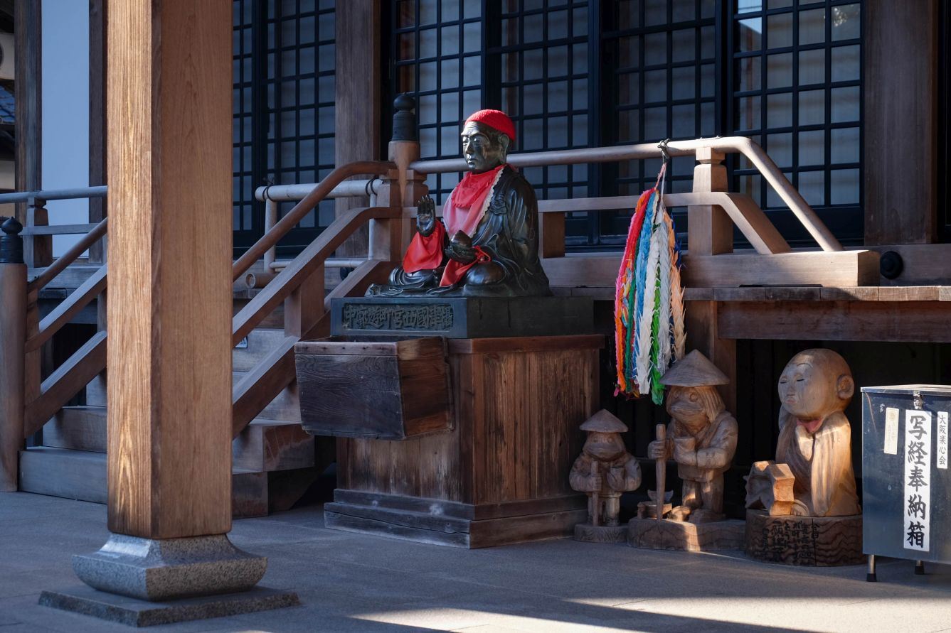 You enter the temple through a gate of stone pillars. The belfry built in 1977 is on the right and the water basin is on the left. The main hall reconstructed in 2004 is ahead of you, and the Daishi Hall built in 1908 is to the right of the main hall. To the left of the main hall are a guest hall and the temple office, and to the left is the Matō Kannon Hall. Behind the main hall is a repository of important cultural properties including the main statue, Yakushi Nyorai. This is not open to the public.