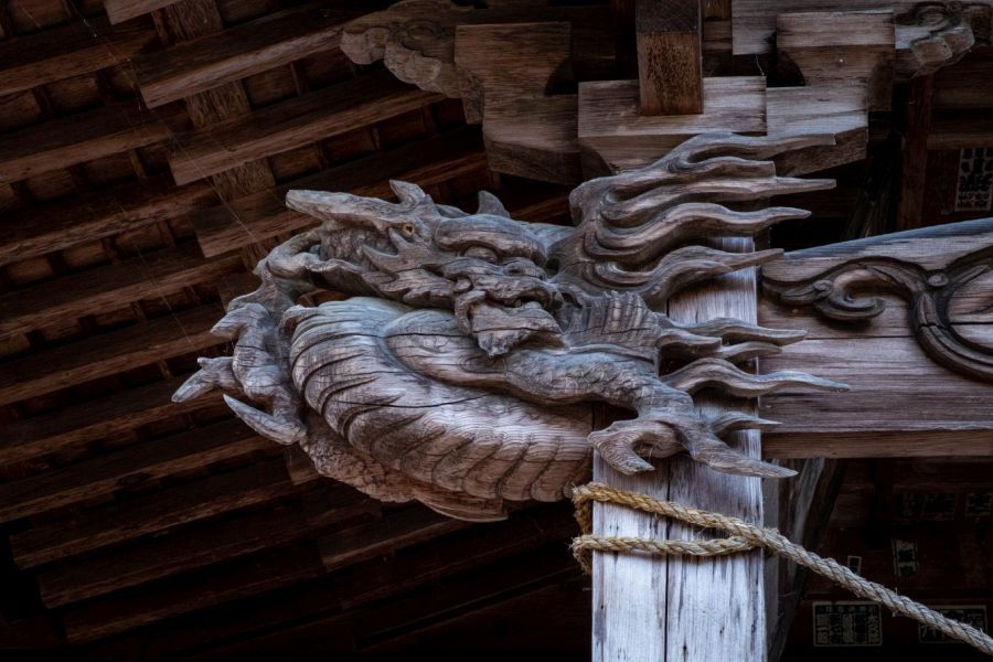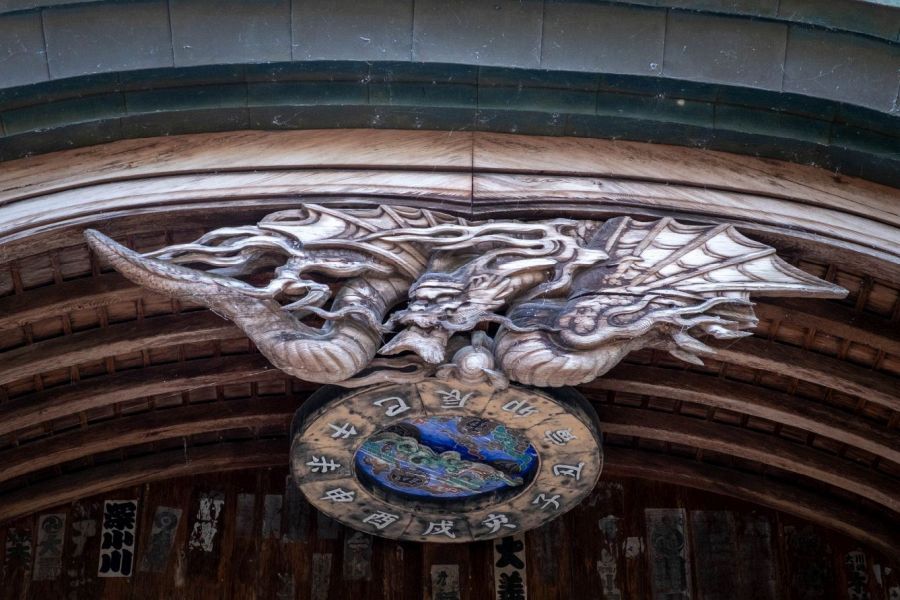 Walking pilgrims must climb some long steps that pass through a main gate decorated with fine dragon carvings and paintings. The painting was done by Kubo Nansō in 1900. The temple guardians inside the gate have hollow eye sockets and their fingers are now just pegs, creating a rather creepy impression.