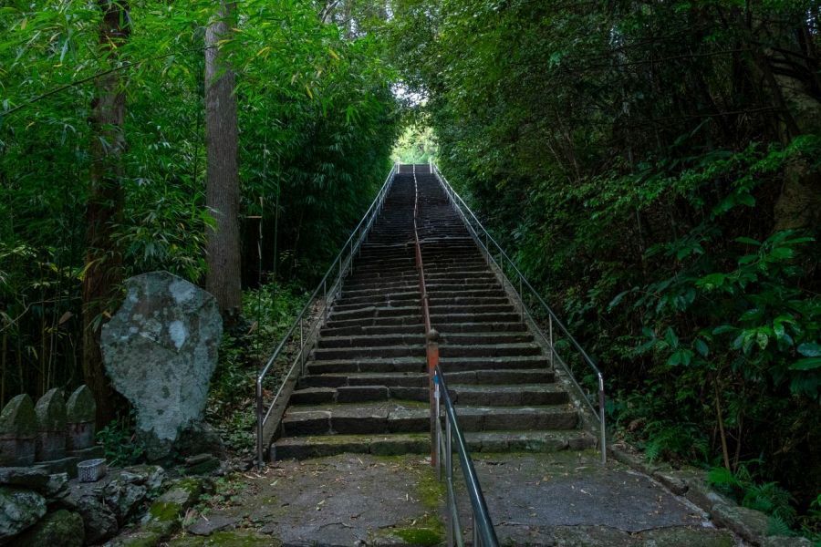 Beyond the gate, a long flight of stone steps continues up to the precincts. To the right of the approach stands the belfry. Further back are the guest hall and temple office. Ahead, to the right, is the purification basin; to the left stands a large statue of Yakushi Nyorai, the Medicine Buddha, built in 1933. In the plinth of the statue is a doorway. Enter it and head round to the left and it gets dark very quickly. There are eighty-eight steps that go up and down and round at a sharp angle, until you come to a mercifully illuminated altar where you can pray not to be such a coward in future. This is alleged to warding off misfortune, but the experience is itself a considerable misfortune.
