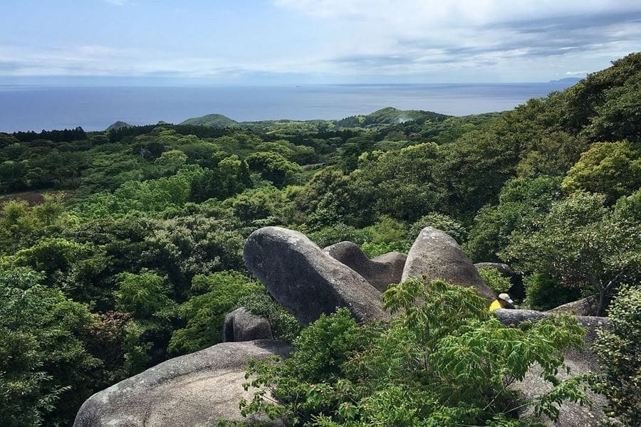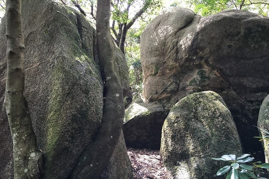 Tōjindaba is a prehistoric megalithic site located on a hill above Cape Ashizuri. This mysterious and impressive group of massive stones dates from the Jōmon period, from about 12,000 BC to about 300 BC, when the Japanese were hunter-gatherers with a relativity complex culture. The site comprises a flat henge or stone circle area that was unfortunately bulldozed flat before any excavation could be performed. From here you can see clumps of huge stones on a hillside. The henge area has a few boulders remaining. From here it’s a short walk up the hill to megaliths. The magnetic properties of these vast stones indicate that they were moved at some stage, but whether this occurred through glaciation or by human effort isn’t known. The rocks, which have interesting natural veins, also show signs of having been shaped by humans. They bear a close resemblance to the dramatic boulders that top Mt. Misen on Miyajima in Hiroshima, although there are far less people here.
