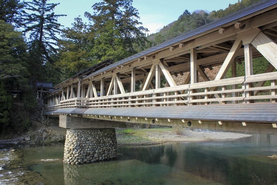 At the north end of the main street stands a wooden torii gate and spectacular covered bridge over the Yusuhara River. This is the approach to Mishima Shrine. The path that the defectors took leads into the woods behind the shrine.