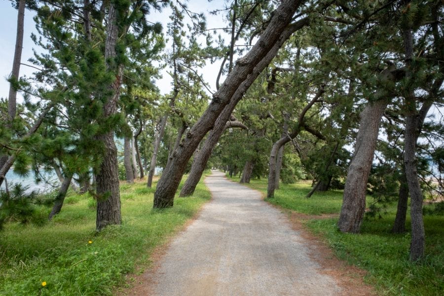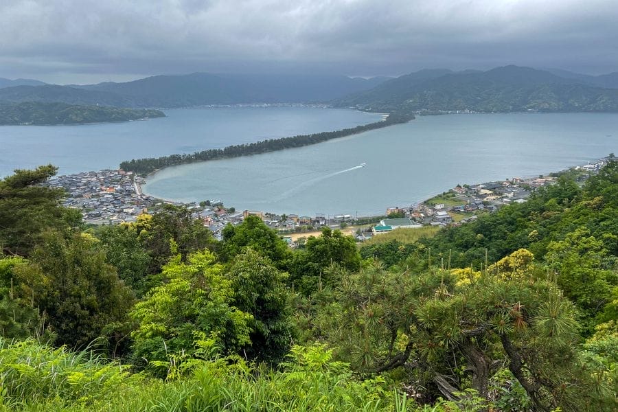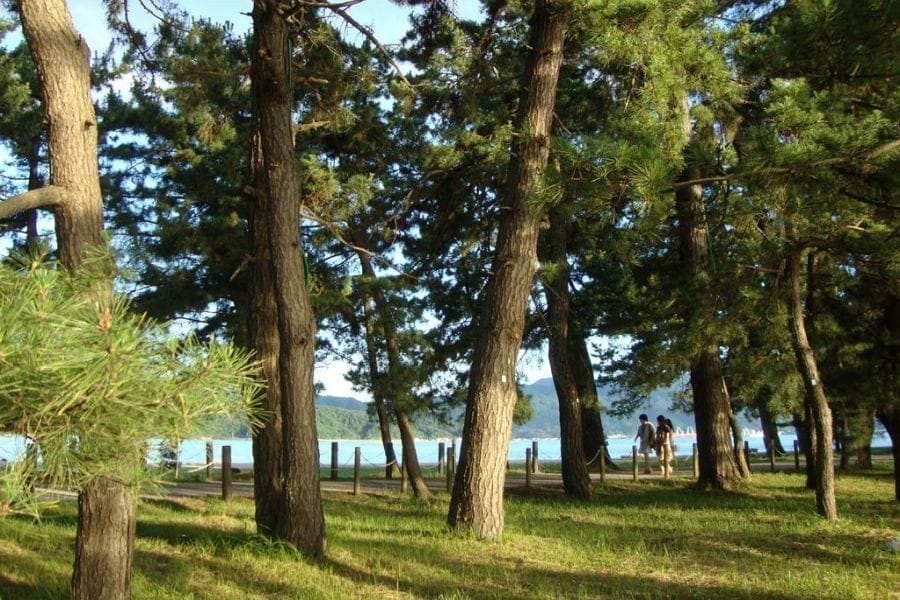 You can walk or cycle over the sandbar on a trail that passes through some 7,000 pine trees. Amanohashidate can be viewed from the mountains on either side of the bay, from whence the sandbar is said to resemble a dragon. Bending over and looking at the sandbar from between your legs is said to make it seem more like a stairway to heaven. Facilities are provided at the overlooks to facilitate this folly.